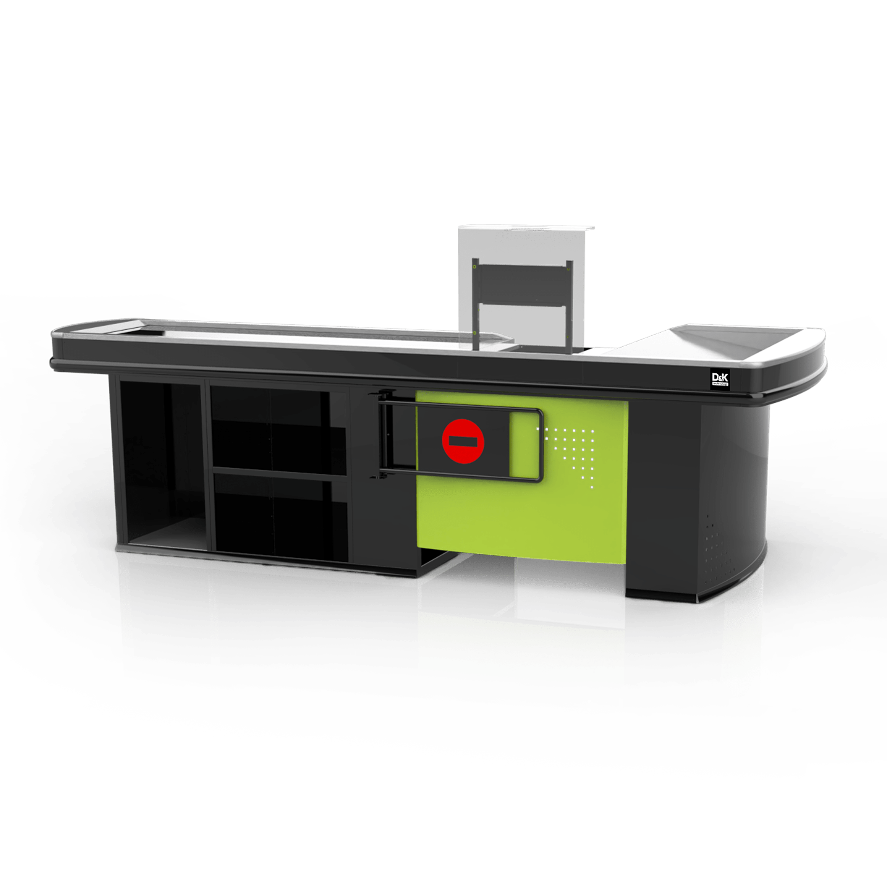 - miejsce na koszyki i reklamówki pod taśmą ze strony klienta lub kasjera
