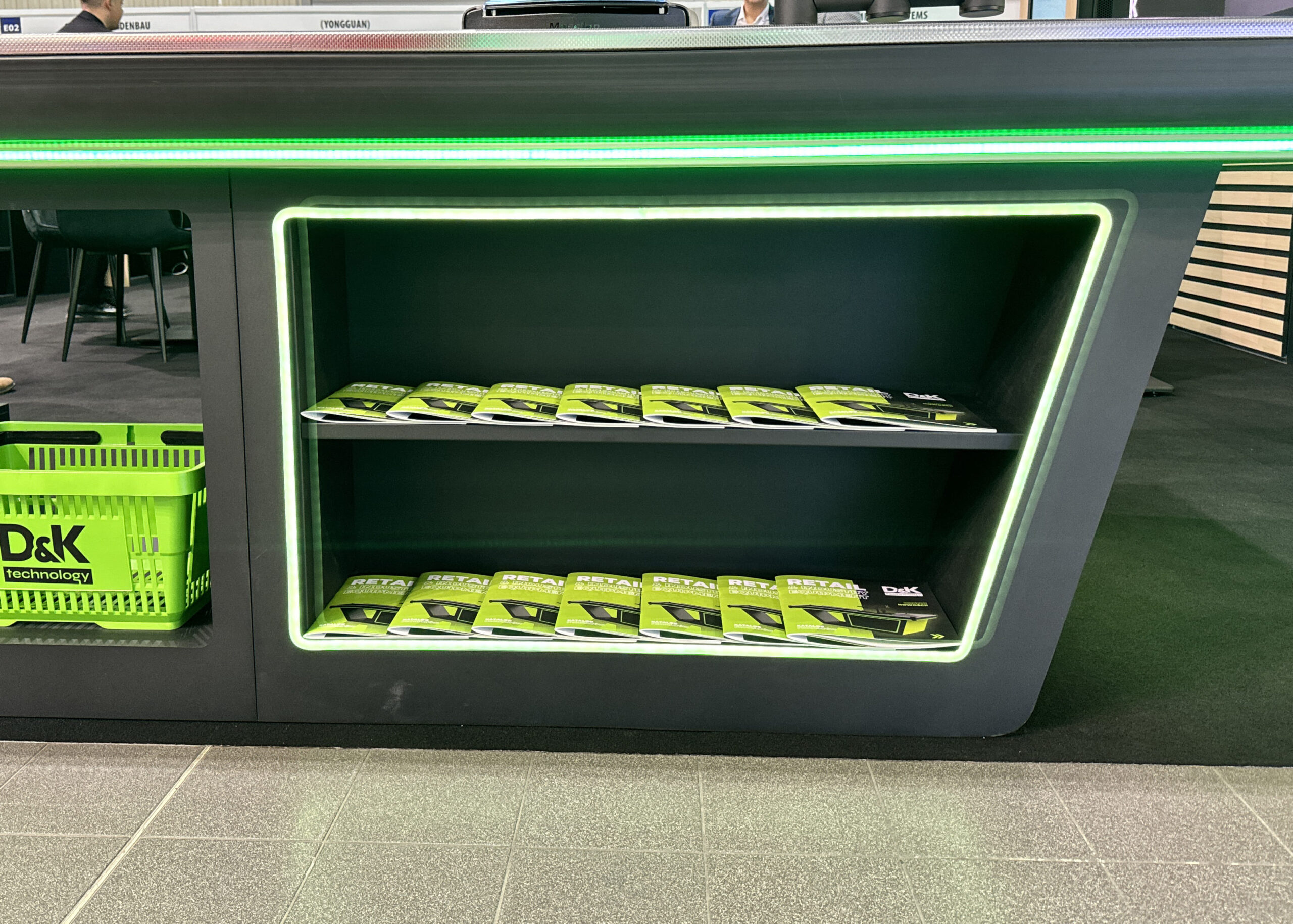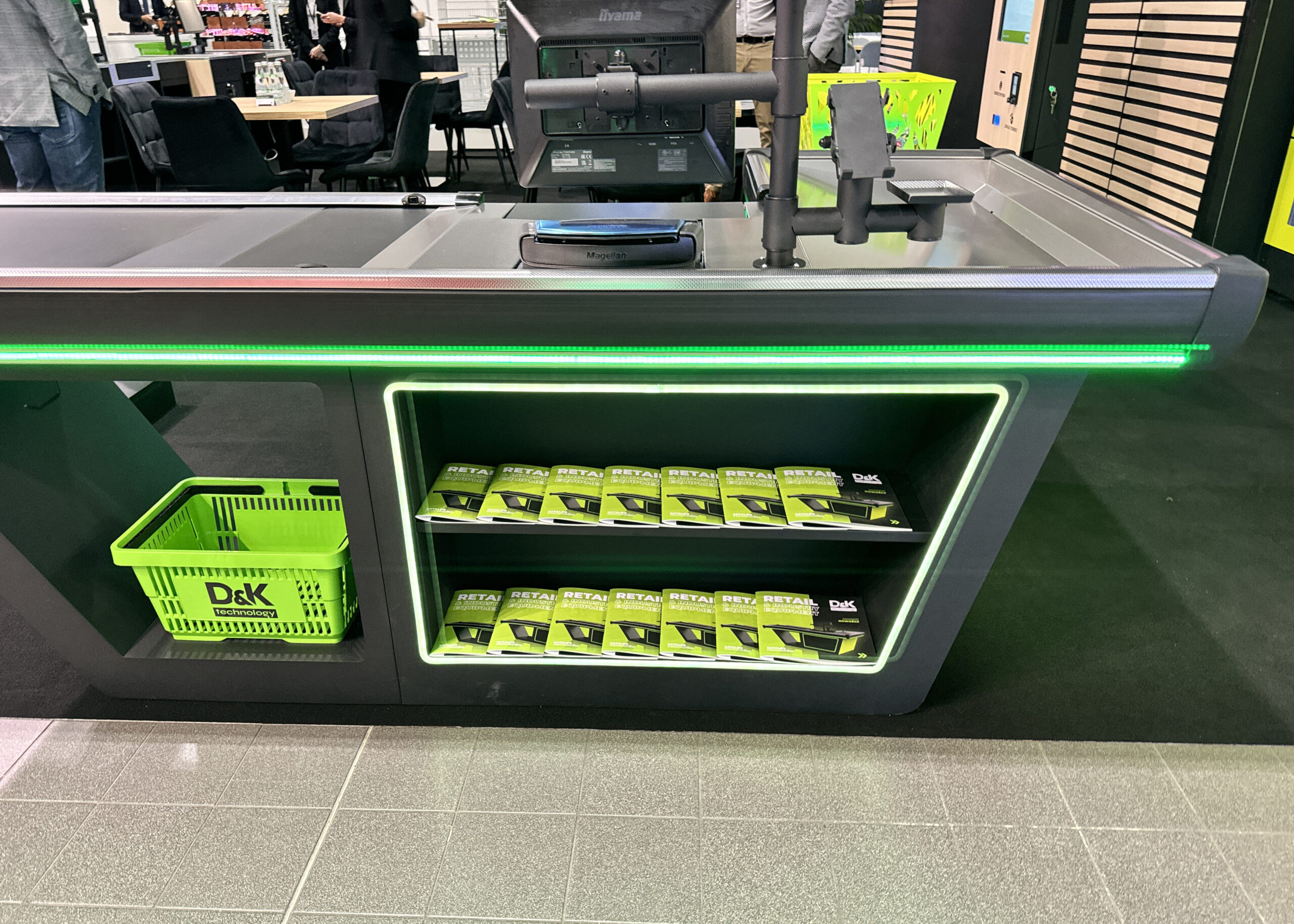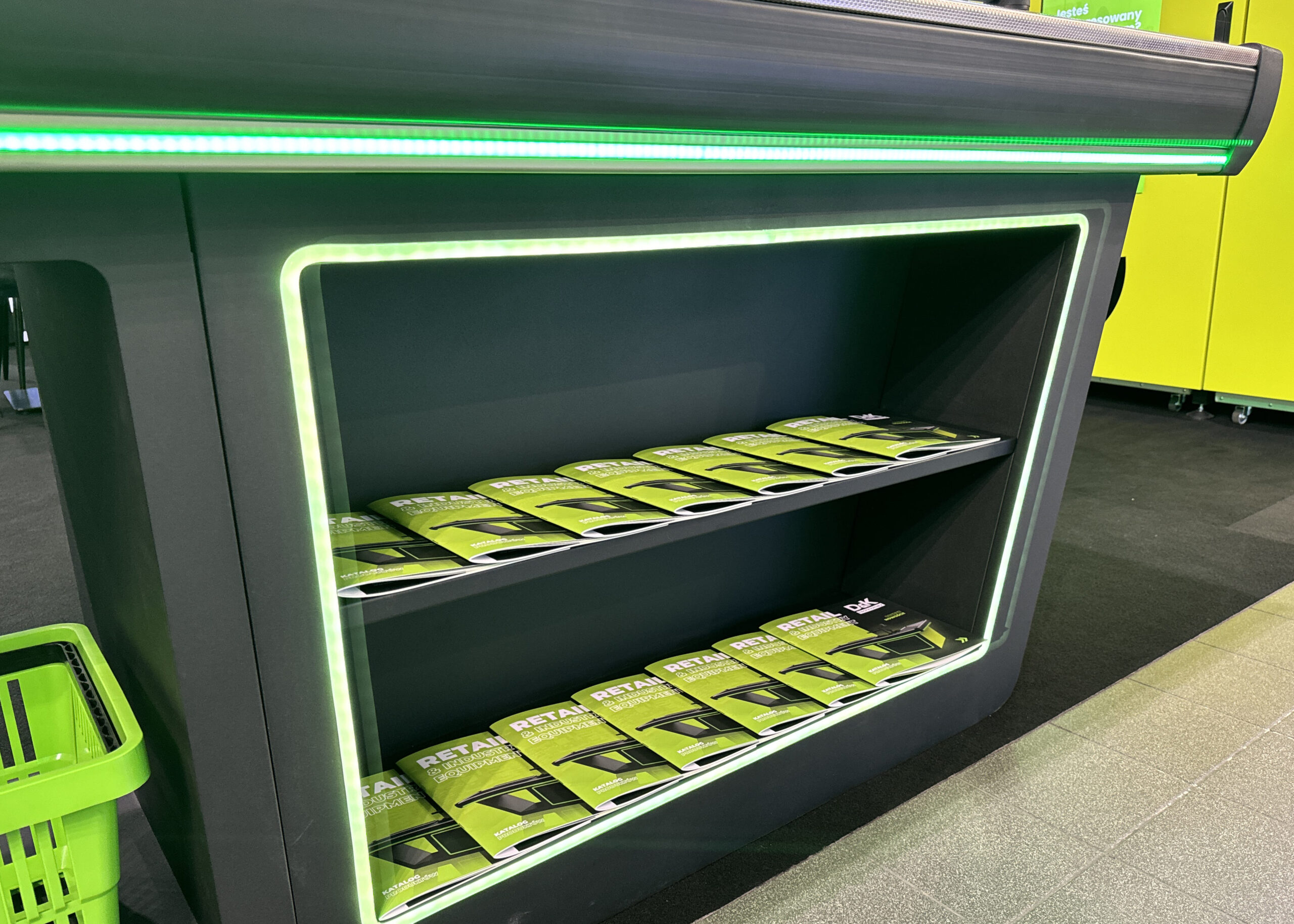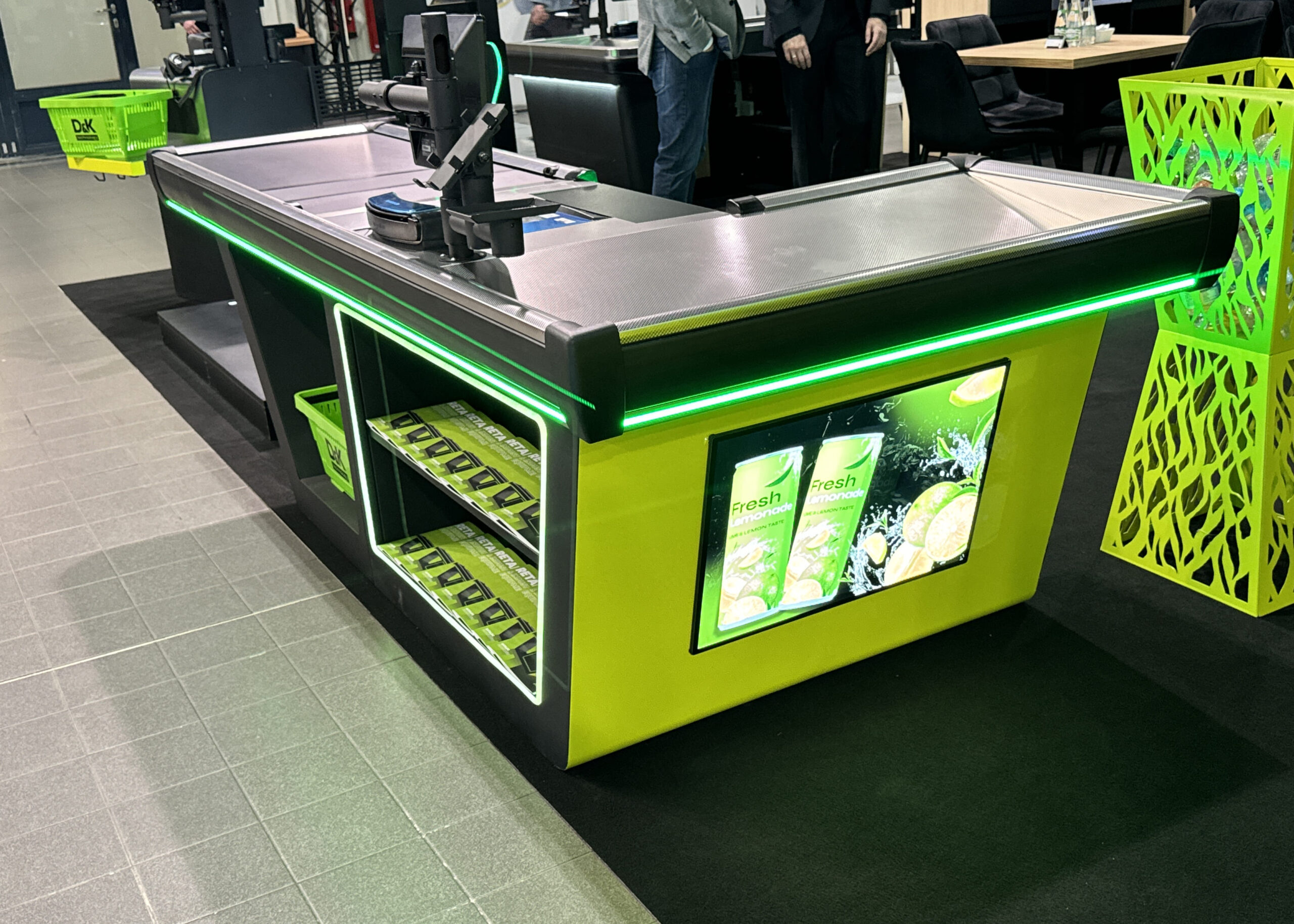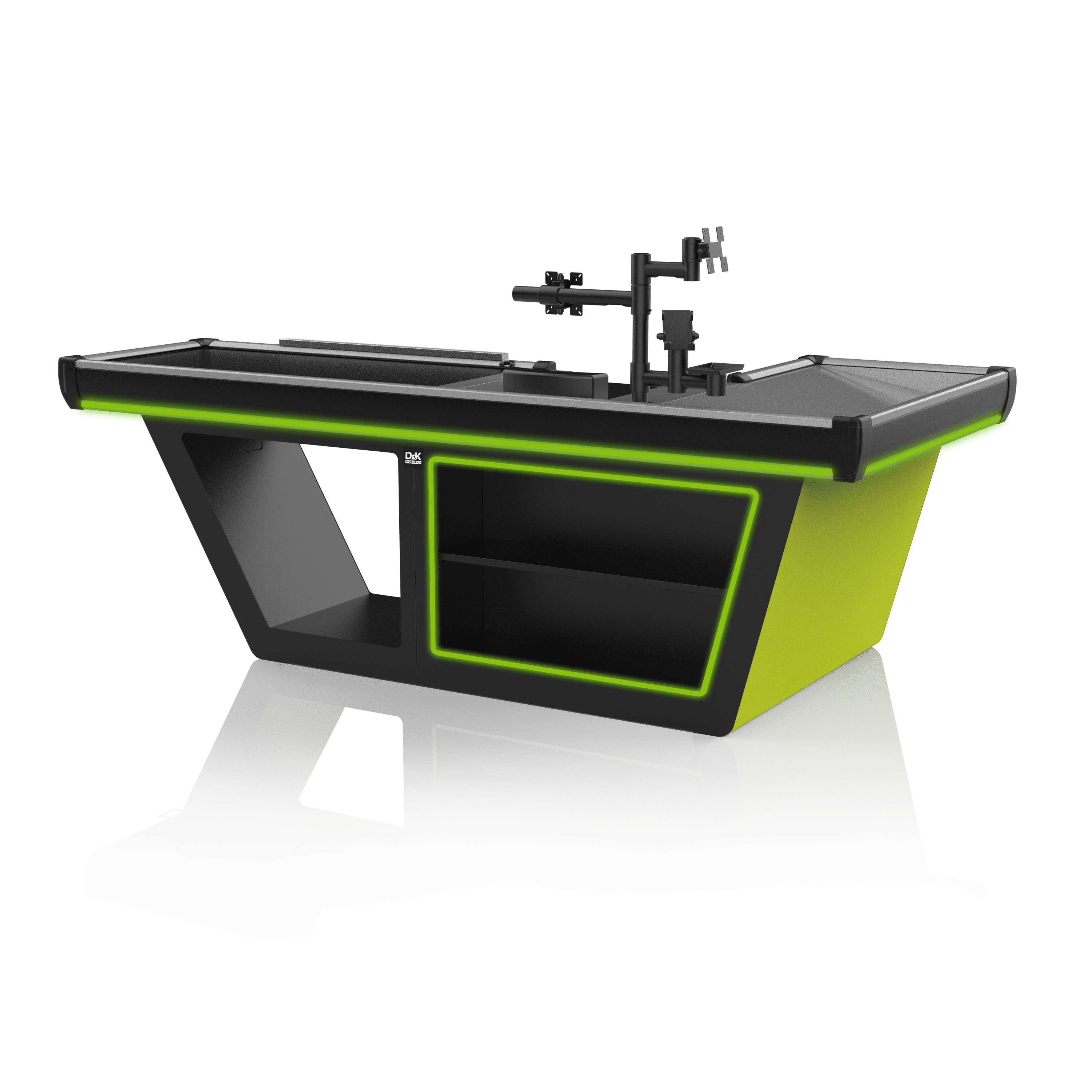 A modern checkout counter from the latest LIGHT series, characterized by a cut leg and subtle LED lighting around the shelves.