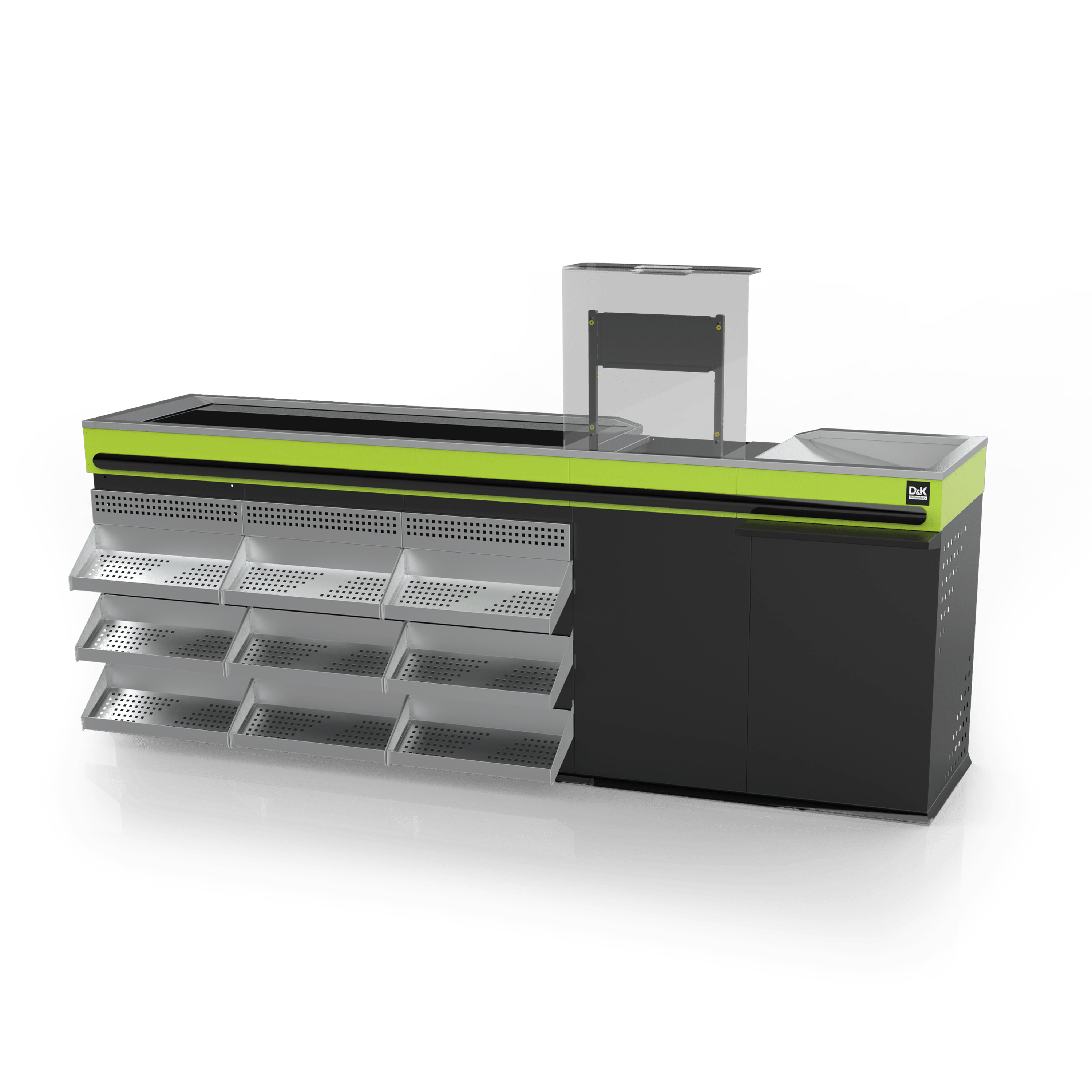Checkout boxes are available with either a wide or narrow packing bay of various lengths.