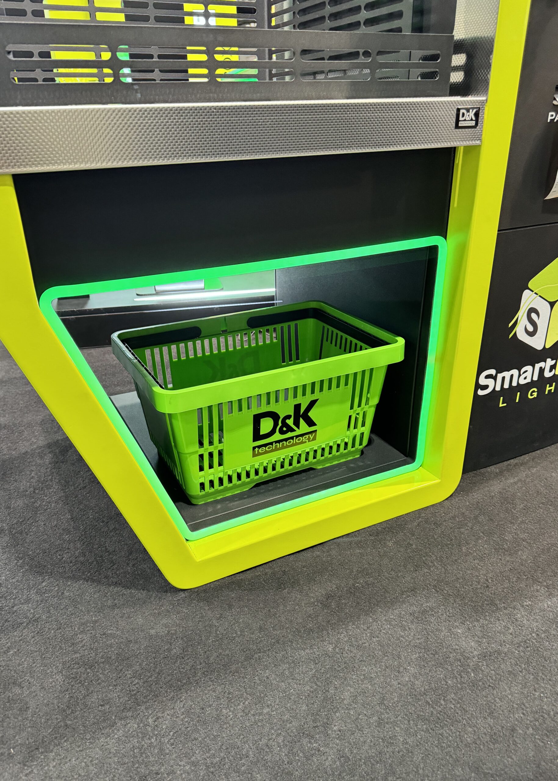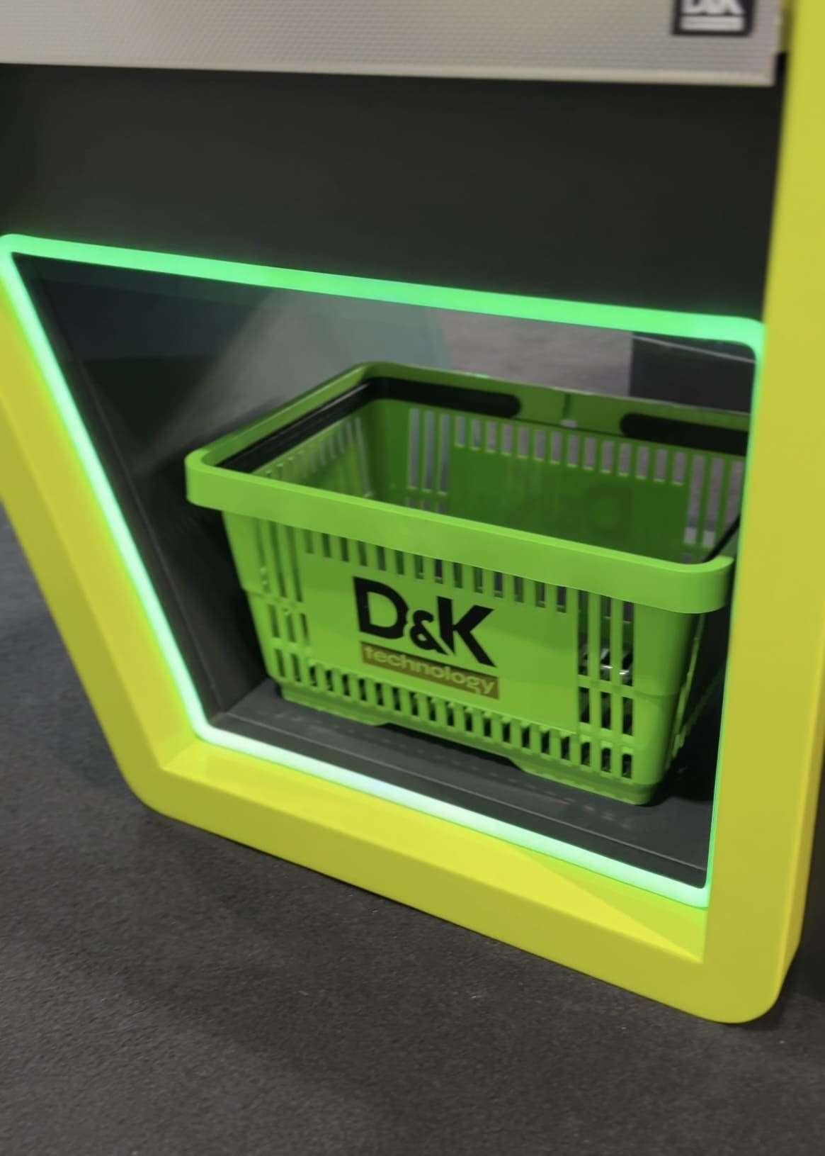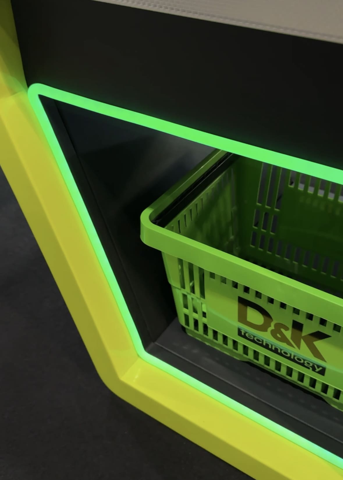 Kasa samoobsługowa o nowoczesnym i lekkim designie, wyróżniającym się otworem na koszyki oraz świecącym LED-em, który sygnalizuje dostępność kasy.